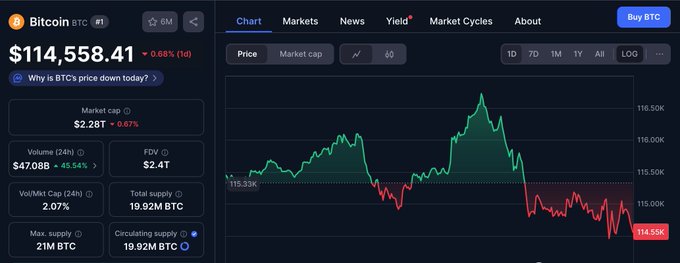 The global cryptocurrency market cap sits at $3.99 trillion, marking a 1.8% to 2% decline in the past 24 hours. Bitcoin (BTC) is trading around $114,700, down 0.7%, while Ethereum (ETH) lags further, slipping 1.8% to $4,517. Solana (SOL) and other altcoins are under heavier pressure, reflecting broader risk reduction. Intraday volatility remains elevated as traders consolidate positions.