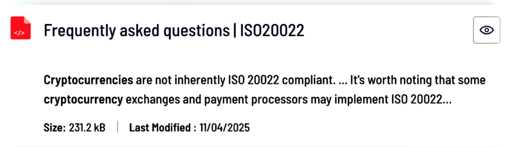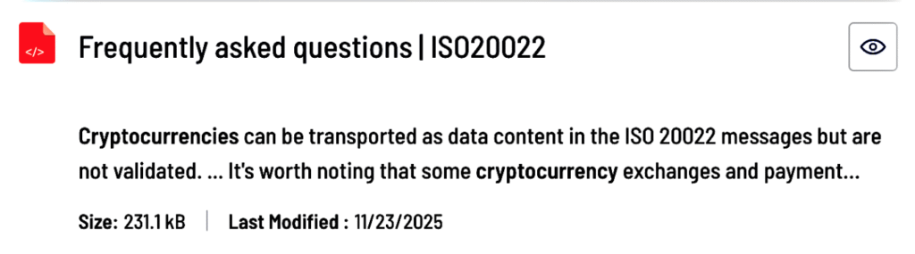 The ISO 20022 FAQ clearly states that “there is no official certification authority for ISO 20022.” The standard governs financial messaging formats, not the approval of cryptocurrencies or blockchain tokens.