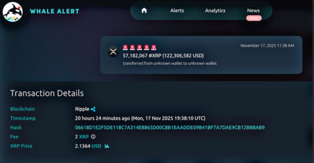 Blockchain tracker Whale Alert detected a massive 57,182,067 XRP transfer — valued at roughly $122 million — moving between two unidentified wallets. The timing immediately triggered speculation across the crypto market as analysts noted its proximity to the upcoming Franklin Templeton spot XRP ETF rollout.