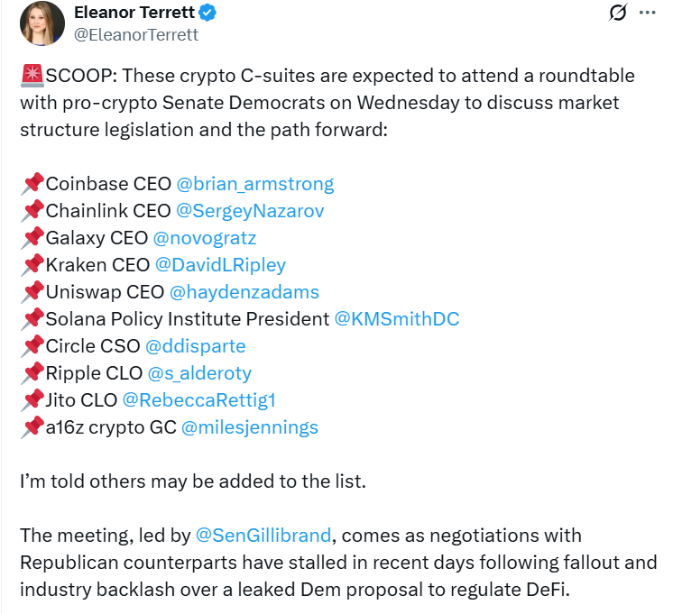 - 🏛️ Gillibrand Leads Capitol Hill Discussion: Senator Kirsten Gillibrand will host a high-level meeting with top crypto executives to reignite efforts behind the stalled U.S. Crypto Market Structure Bill.