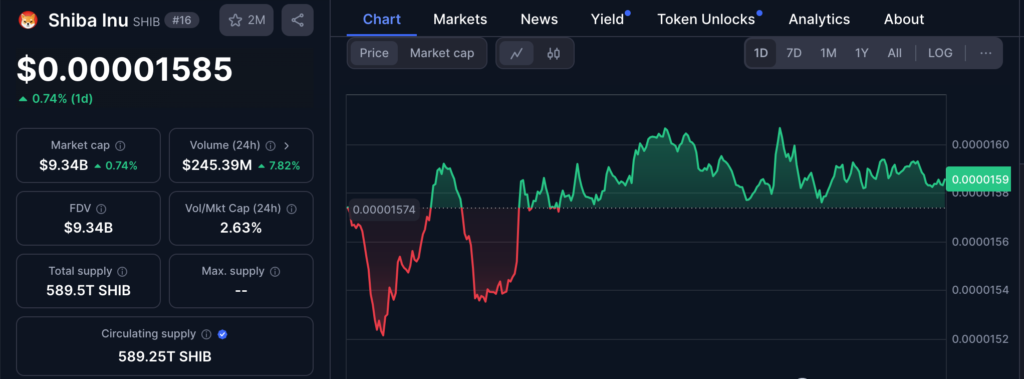 As of the latest market update, Shiba Inu (SHIB) is trading at $0.00001591, reflecting a 1.05% increase in the past 24 hours. The token’s market capitalization stands at $9.37 billion, with a 24-hour trading volume of $247.82 million, up 4.73%. With a circulating supply of 589.25 trillion SHIB, the fully diluted valuation (FDV) is estimated at $9.38 billion. While SHIB remains volatile, its future performance will depend on ongoing ecosystem developments and broader market trends.